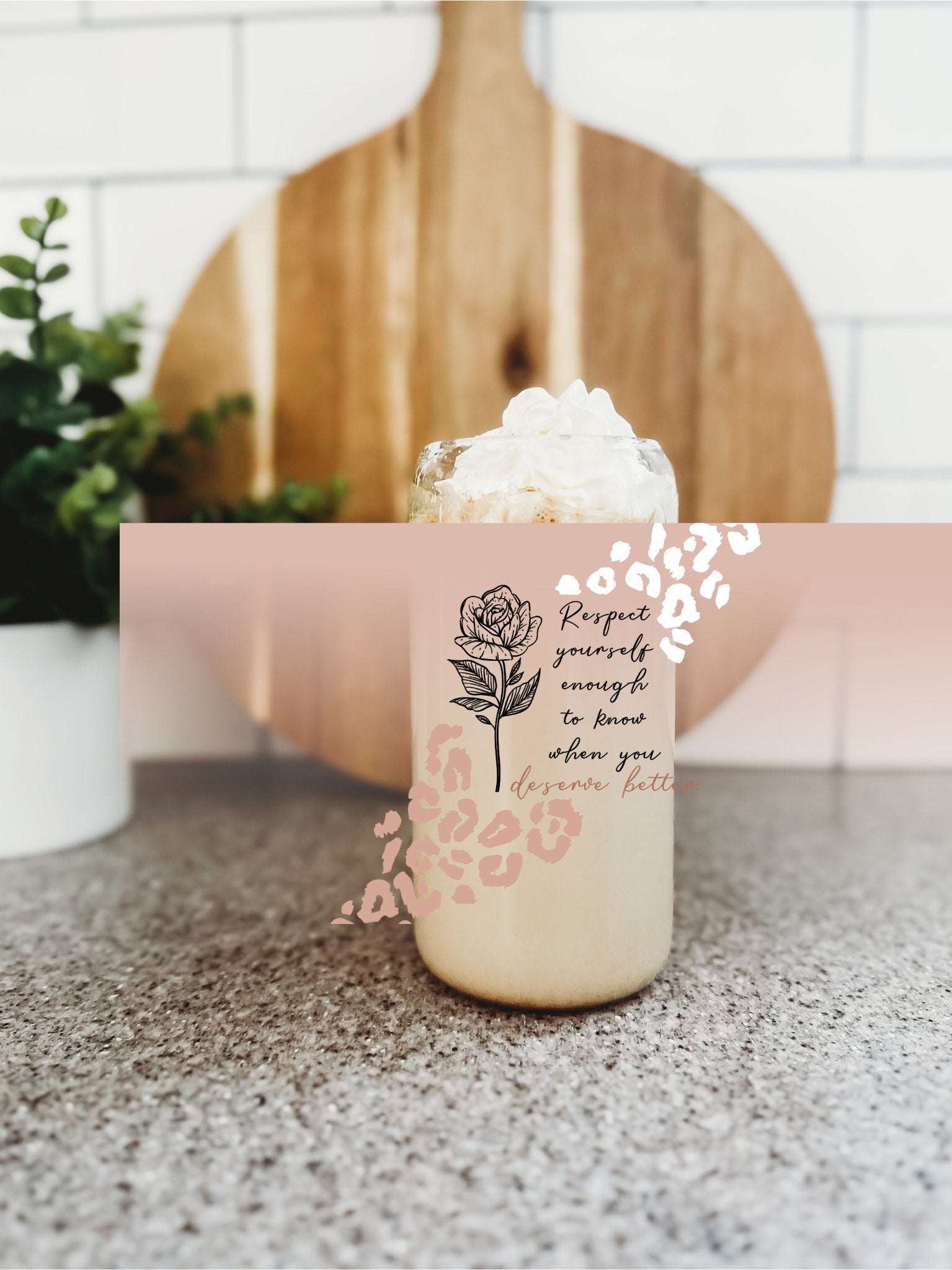 Crafted with precision and care, the Affirmations glass Can hold 16oz and comes with an acrylic lid and straw. Each piece is made to order and should be hand washed for best results.