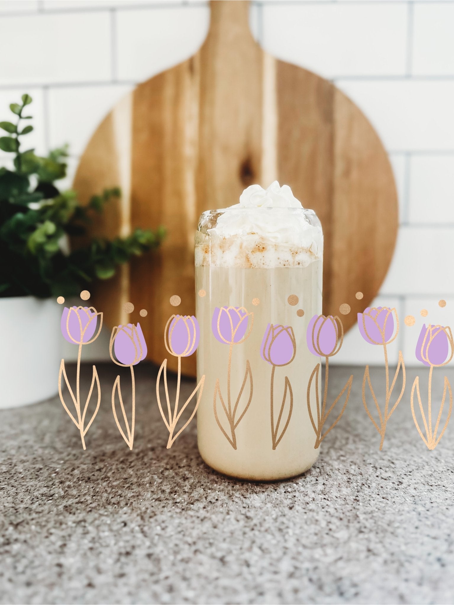 Crafted with precision and care, the Gold and Purple Tulips glass Can hold 16oz and comes with an acrylic lid and straw. Each piece is made to order and should be hand washed for best results.