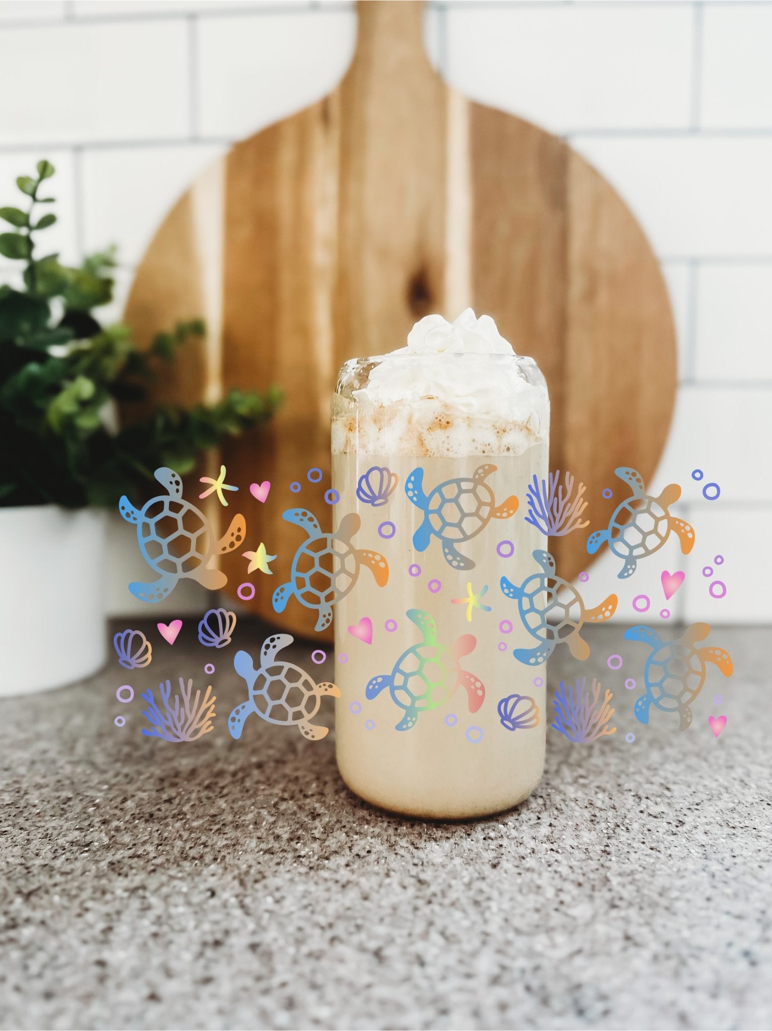 Crafted with precision and care, the Sea Turtles glass Can hold 16oz and comes with an acrylic lid and straw. Each piece is made to order and should be hand washed for best results.
