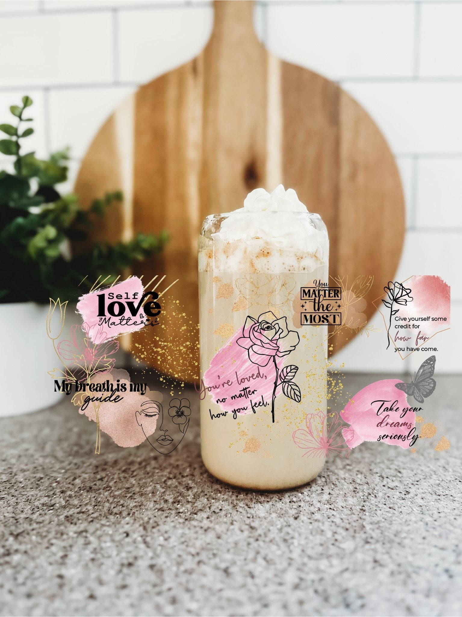 Crafted with precision and care, the Self Love Affirmations glass Can hold 16oz and comes with an acrylic lid and straw. Each piece is made to order and should be hand washed for best results.